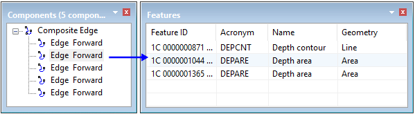 All features that share any spatial values with the selected edge are displayed in the Features window.