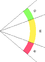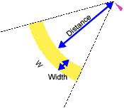 Sector Band <bnd | The sector band represents the type of light sector. It forms an arc that extends from one sector arm to the other. A sector band will be drawn in the COLOUR attribute of the light. If COLOUR is not set, or if it is not a valid colour for sector lights, it will be magenta. If the Light Visibility (LITVIS) of the light is “Obscured”, the Width will be ignored, and the sector band will be a black line. • Enable: • On: The sector band options are available. A sector band will be created. • Off: The sector band options are not available. No sector band will be created. • Distance: The distance from the light to the sector band in millimetres at map scale. • Width: The width of the sector band in millimetres at map scale. The outside boundary (distance + width) must be less than or equal to the sector arm length |