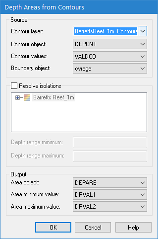 Resolve isolations | The settings to use for resolving isolations. 1. Enable the Resolve isolations option. 2. Select a height source from which elevation values are to be read. 3. [Optional] Enter values for Depth range minimum and/or Depth range maximum to define the range of values that can be assigned to the depth areas. |