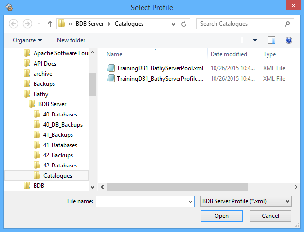 A database’s catalogue is initially determined by the Pool and Profile properties defined when the database is created. If these properties are not defined, the "BathyObjectPool" and "BathyObjectProfile" environment variables are used by default.