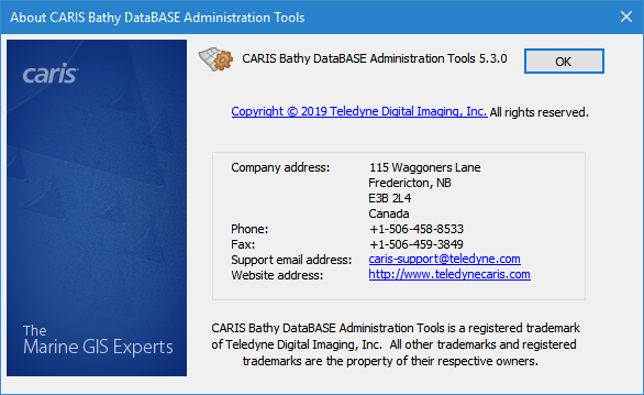 The About CARIS Bathy DataBASE Administration Tools dialog box is displayed.