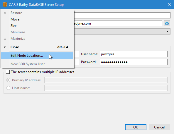 The Bathy Node Location Editor modifies the configuration file "filesystemtable.bfs" which, by default, is installed in the C:\Program Files\CARIS\BDB Server\<version>\system folder. This location is typically restricted for read/write access to system administrators only. If the Windows® account that is being used to execute these functions does not have appropriate credentials, the filesystemtable.bfs file cannot be modified and the Node Location Editor functions will not complete successfully. Ensure that the account with which you are connected has the necessary permissions and ensure that the Server Setup Utility is started with the Run as Administrator option.