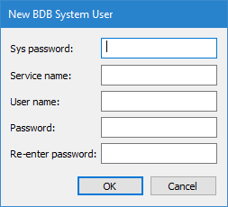 The New BDB System User tool allows you to create a new Oracle administrator user that has less privileges than the default "system" user. This user would be used by the Node Manager to connect to the Oracle server when creating databases and users.