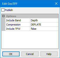1. Click the browse button (...) to launch the Edit GeoTIFF dialog box. 2. Click the Publish check box at the top of the dialog box to have products created in this format. 3. Click OK. |