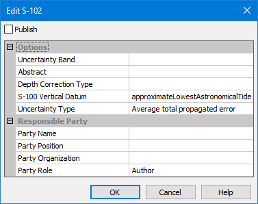Each product format has a different set of options. The options for the S‑102 format are: • Options: • Uncertainty Band: The band in the source data that contains uncertainty values to be included in the resulting products. • Abstract: A textual description of the output product, as per ISO 19115. • Depth Correction Type: Select the type of corrections to apply to depth values in the resulting products. • S-100 Vertical Datum: The vertical datum of the raster source data. • Uncertainty Type: The type of uncertainty data stored in the input band to be included in the S-102 metadata. • Responsible Party: Descriptive identifying information for the responsible party for the data - name, position, organization and role of the user. 1. Click the browse button (...) to launch the Edit S-102 dialog box. 2. Click the Publish check box at the top of the dialog box to have products created in this format. 3. Define any necessary settings. 4. Click OK. |