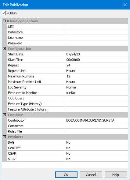 Publishing allows the most up-to-date representation of coverage data in a database to be automatically uploaded to a Bathy Data Service in CARIS Cloud. Coverage data is uploaded to the service as bathymetry data associated to existing gridded cells in the service.