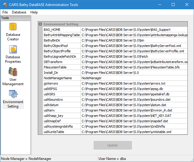 You are returned to the Environment Settings page in the BDB Administration Tools. The new value of the environment variable is displayed in the value field for the selected variable and the Update button is enabled. The Update button is used to commit any changes. If you disconnect from the node manager without committing changes, the settings will revert to the previous values.