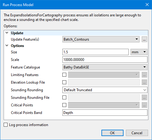The Expand Isolations for Cartography process model provided in the Tools window is used to expand all isolations (small contours) in a dataset, ensuring they are large enough to enclose a sounding feature at a specified map scale. This process is similar to the Replace Tiny Contours command, but provides more options to control how the isolations are expanded.