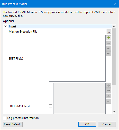 SBET RMS File(s) | The name and location of the SBET RMS file for the CZMIL dataset. More than one file can be added to the list if multiple files were used for the survey. If more than one file is specified, they can be ordered in the list and applied during import in the order they are listed. 1. Click the Browse to File button 2. Use the Up- and Down-Arrow buttons to adjust the order of the items in the list. The Remove button |