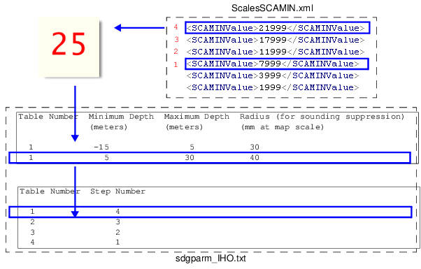 On the first pass, if that sounding is the shallowest within a suppression radius of 40 metres, a table value 1 is used to assign it a step number of 4. The step number is then used to determine a SCAMIN value from ScaleSCAMIN.xml.