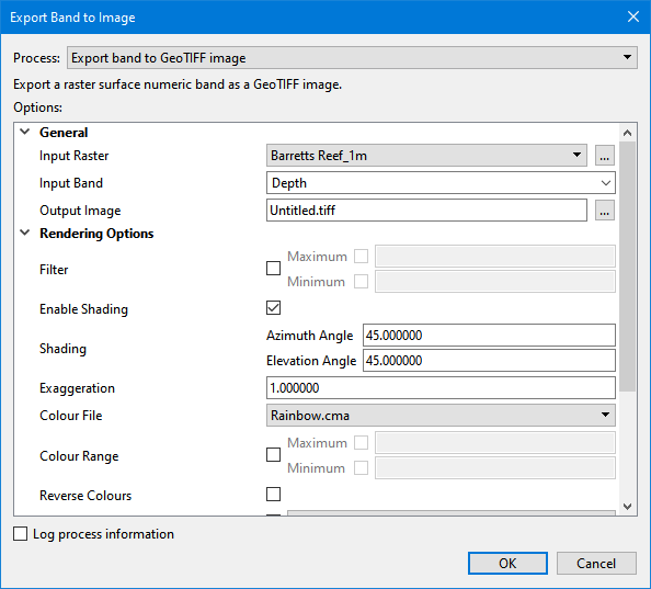 The Export Coverage to Image command exports a single numeric band from a raster surface to an image format. This is accomplished by first converting the values from the selected band into colours using the Render Raster process. The resulting image will have the same dimensions, coordinate reference system and geographic extent as the input. The resulting data is then converted to the selected image format using the Export Raster process.