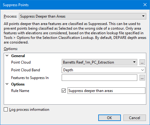 Suppress Deeper than Areas: All points deeper than referenced area features are classified as Suppressed. Only area features with elevations are considered by the process, based on the elevation lookup file specified in the Selection Classification Lookup setting in Tools > Options > Files and Folders. By default, depth area (DEPARE) features are considered. This process can be used to prevent points from being classified as Selected on the wrong side of a contour.