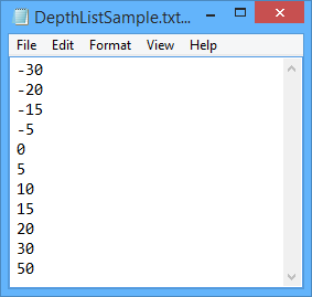 A sample list is provided when the CARIS application is installed. This file can be used, or you can make a copy of the file and edit it as needed. The sample list, DepthListSample.txt, can be found at:
