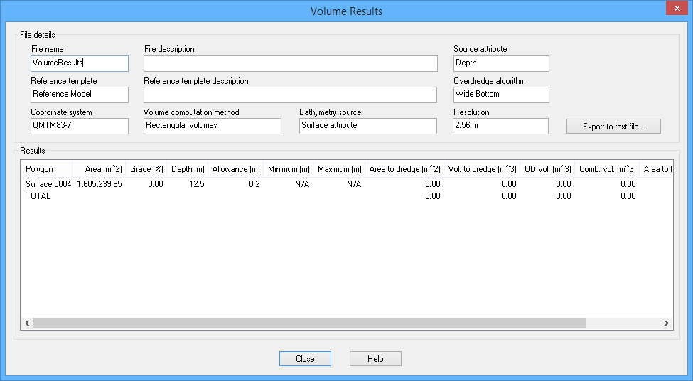 The Volume Results dialog box is displayed, populated with the data from the XML file. This information can be exported to a text file for future reference, if desired.