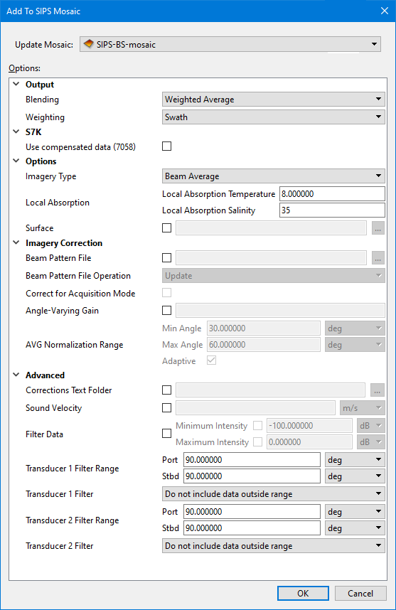 Weighting | The method used to weight pixels across a single ping. The default value is SWATH. Select from: • Swath: Weighting is based on sonar geometry where Nadir has a low weight, off-nadir has the highest weight, and a decay function is used to decrease weighting out to the swath edge • Fixed: All values are weighted equally across the ping (primarily for SAS imagery). | |
