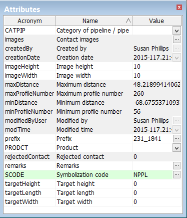 The attributes of a selected contact in Side Scan Editor are displayed in the Attributes window. Fields that uniquely identify the contact are not editable and are highlighted in grey.