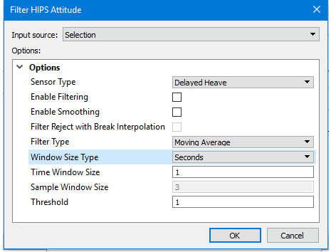 The Attitude filter is used to reject attitude that falls outside of defined boundaries. Use the Filter HIPS Attitude dialog box to select the sensor attitude data to filter, enable filtering and smoothing functions, and set the type of, and parameters for, filtering, and then apply filtering.