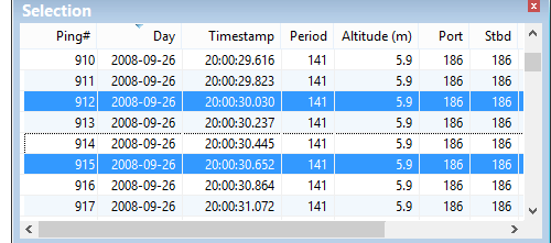 When you make a selection in the Side Scan View, the start and end ping numbers of that selection are displayed in the Selection field of the Properties window.