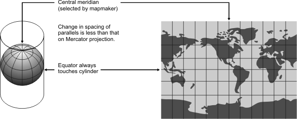 Mathematically projected onto a cylinder tangent at the Equator