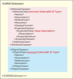 The structure of the a dictionary file is shown below. Attributes are shown in red.