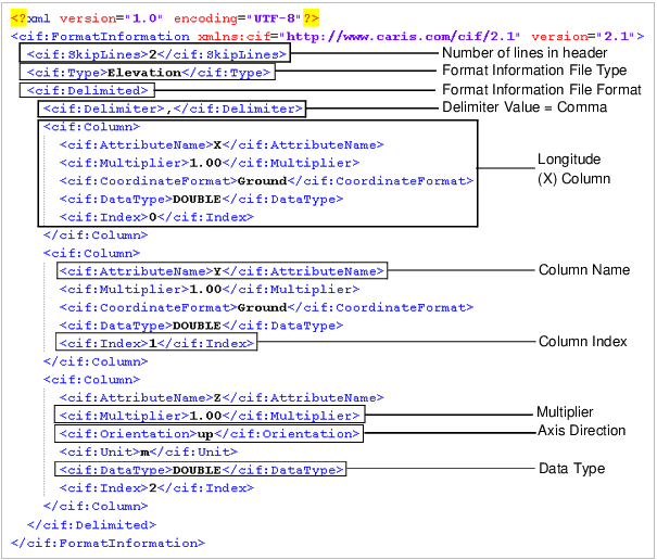 <cif:Delimited> <cif:Delimiter>,</cif:Delimiter> <cif:Column> <cif:AttributeName>X</cif:AttributeName> <cif:Multiplier>1.00</cif:Multiplier> <cif:CoordinateFormat>Ground</cif:CoordinateFormat> <cif:DataType>DOUBLE</cif:DataType> <cif:Index>0</cif:Index> </cif:Column>