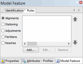 Once a station catalogue is created, the Rules tab of the Model Feature window is used to associate the relevant templates and alignments to the station catalogue and to define all rules for stationing, partitions, reaches and labelling of these items. Once defined, can access the station catalogue rules any time to edit or delete them.