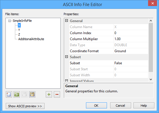 Because the format information file needs to match the contents of the ASCII file, it is recommended that you have the source data displayed in the preview when defining properties.