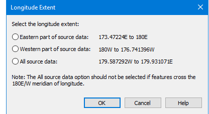 The S-57 standard does not allow products that straddle or cross the 180° meridian. If data crosses the meridian in any of the input datasets, this button is displayed.