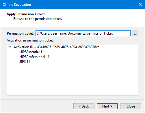 This step generates a permission ticket request file. This file contains the AID for the activation being revoked and must be provided to the license administrator in order for the activation to be revoked in the license portal. The file can either be submitted directly using email, if available, or saved to a portable storage device that can then be taken to another computer that has internet access and the file can then be delivered from that machine.