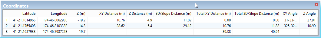 As you click, control points are added to the display and the measurements between the last point and the cursor are displayed in the Coordinates window. The starting point is represented by a larger square, and the current point is represented by a red square.