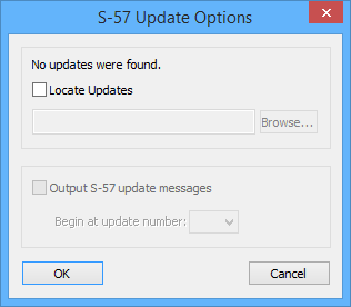 At the time of opening, the application will check for updates to the data. If updates exist and they are located in the same directory, the file will automatically be up-to-date. If there are no updates in the folder with the file, the S-57 Update Options dialog box is displayed.