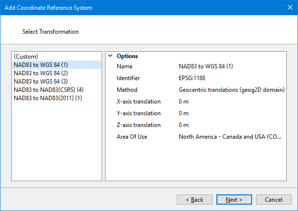 If the geodetic coordinate reference system selected in the previous step has transformations available for it, they will be displayed in the list. This step will not appear if you chose WGS84 in the previous step.