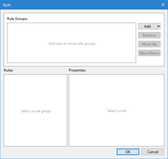 The Style property is used to define display portrayals for data based on user-specified classifications. A different style can be applied to each layer to easily identify data according to its classification. A style consists of rule groups that essentially filter the data in the Display window based on attribute values. Each rule group is defined in either the Classification dialog box or the Filter dialog box and then applied to the data. A set of rules is automatically generated from the specified criteria and the values in the source data. Multiple rules can be defined and ordered for a single style definition.