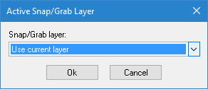 • The toolbar button is displayed when the toolbar is in a vertical position. This button launches a dialog box containing the same drop-down list that is provided in the horizontal toolbar. Selecting a layer from the list sets that layer as the snap/grab target.