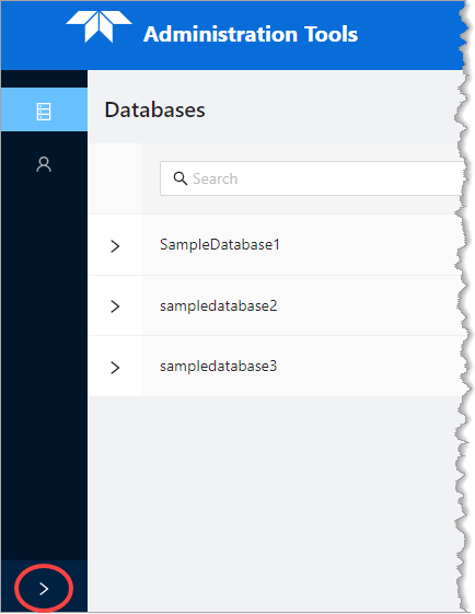 The default view of Administration Tools is the Database page, which provides a list of all databases that have been created in the server instance.