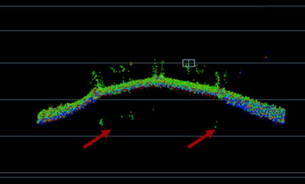Pre-pulses occur over the laser illuminated area when there is contrasting reflectance (an example would be white paint marks on a runway). The waveform peak detection algorithm detects these peaks and results in points being incorrectly reported above the actual ground.