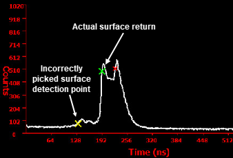 After-pulses are smaller amplitude signals that may occur after an actual strong return pulse in a lidar waveform. After-pulse is a characteristic of Photo-multiplier tubes (PMT) and occurs when the actual pulse crosses a certain amplitude threshold. The waveform peak detection algorithm detects these peaks and results in points being reported below the actual ground.