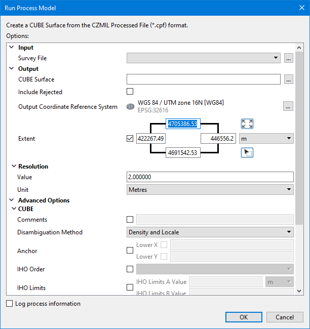 If a survey file is open in the application at the time the process model is launched from the Tools window, the coordinates fields are populated with the extents of that survey by default. They can also be specified manually using one the three methods available: