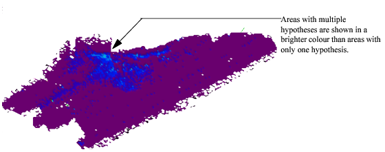 • The Hypothesis Count layer is a visual representation of hypothesis density at a node. A Surface with a Hypotheses Count layer is displayed below.