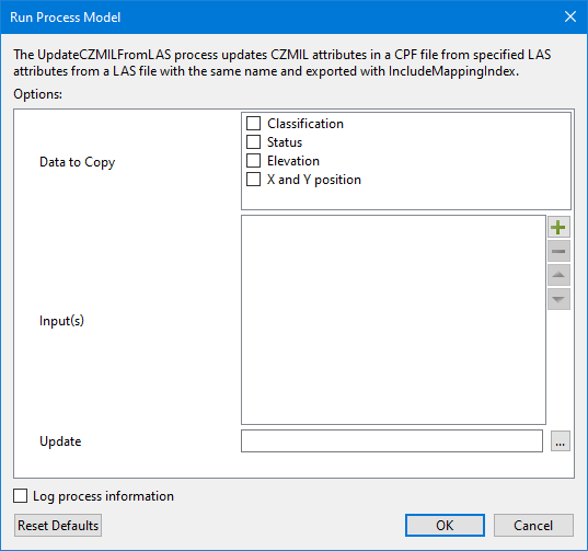 The Update CZMIL from LAS process updates CZMIL attributes in a CPF file that have the same name as specified attributes from one or more LAS files.
