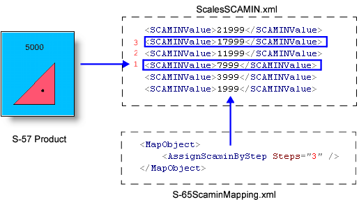 S-57 Composer checks the compilation scale of the product against the <SCAMIN> list and then applies the number of steps defined in S‑65_ScaminMapping.xml to each feature. This assigns the final SCAMIN value.