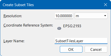 Layer Name | The name of the layer that will be created to store the subset tiles. A new layer is created each time that subset tiles are created. This is a temporary layer that must be saved if the subset tiles are to be retained. If multiple layers are created for multiple sets of tiles, the layers can be grouped to simplify working with the multiple layers. See Group / New Group for more information. 1. Type a name for the subset tiles layer. |
