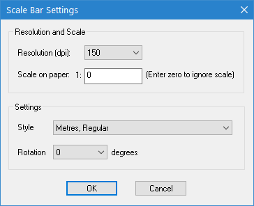 Scale bars | A scale bar object adds a scale bar to the display using the currently selected data. 1. Select a scale bar object in the Publication objects list and click Properties. The Scale Bar Settings dialog box is displayed. 2. Select the Resolution setting for the scale bar. 3. Type a value for the Scale on paper (or type 0 to ignore the scale). 4. Under Style, select the unit of measure to use for the scale bar. 5. Select a rotation angle for the scale bar from the Rotation list. 6. Click OK. The Capture button is now active. 7. Click Capture to commit the settings to memory. The scale bar object now has a check mark beside it in the Publication objects list. |