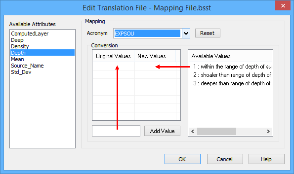 Conversion | The conversion criteria to use when mapping enumerated attribute values. 1. Type the existing attribute value in the Add Value field. 2. Click Add Value to move the value to the Original Values field. 3. Double-click an S-57 attribute value in the Available Values list. |