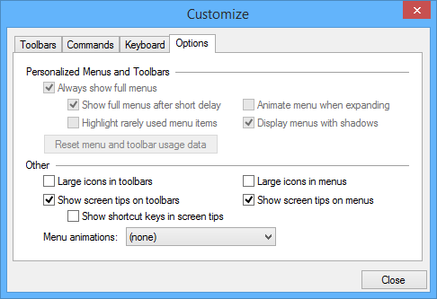 The Options tab of the Customize dialog box controls the way tools are displayed in the toolbars.