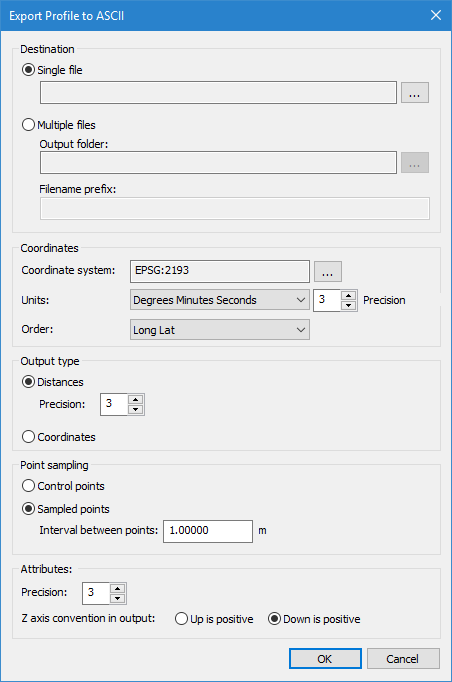 The profile was created using attribute values from the selected source layer. These attribute values will be included in the export. You can define the precision for these values as well as the Z-axis convention to use in the output.