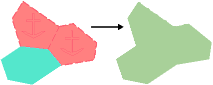 Merge two or more areas into a single area. The merged area inherits the acronym, attributes, and feature object ID of the superselected area and consists of the combined geometry of all selected areas.