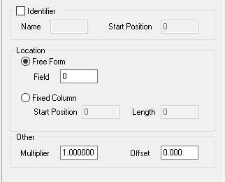 If the check box beside a data type is selected, then that data is present in the raw data file, and available for conversion. Each data type has a set of parameters that are displayed when it is selected. These parameters determine what parts of the text file are parsed for the configuration file.