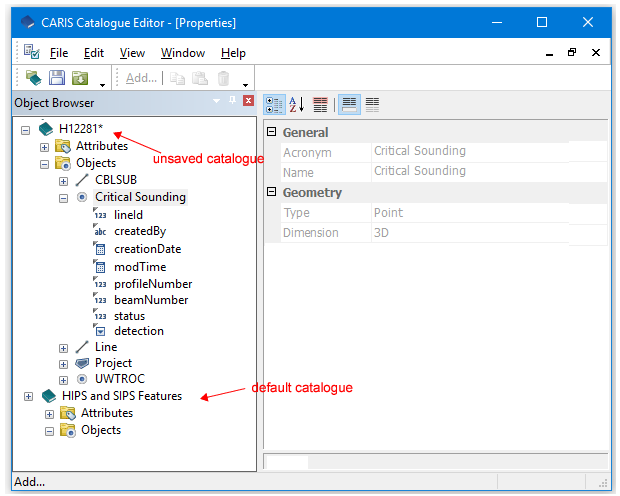 These objects and attributes are listed in the default HIPS and SIPS Feature Catalogue, and are read-only system items. However, you can add new side scan contact objects to the list, and add and edit custom attributes for feature objects.