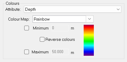 The data can be coloured by any of the following attributes: • Depth • Depth Uncertainty • Position Uncertainty • IHO S-44 • IHO S-57 • Project • Vessel • Day • Line • Amplitude • Detection Method • Detection Type • Transducer • Confidence • Multiple Frequencies Attributes that are based on a range of values (such as Depth and Depth Uncertainty) are coloured using a colour map, as shown in the screenshot above. If a specific range of values is not set for the attribute, it is automatically read from the subset. • The colour at the top end of the selected map will be used for the Minimum value (and all values less than the Minimum value). • The colour at the bottom of the map will be used for the Maximum value (and all values greater than the Maximum value). • The colours between the top and the bottom will be used for the values between the Minimum and Maximum. • The Reverse Colours check box turns the colour map upside-down so that the top colour becomes the bottom colour and vice versa. Attributes that are based on a set of unnamed values (such as Project and Vessel) are also coloured using a colour map. However, in this case there are no Minimum or Maximum options because each value is simply assigned the next colour defined in the colour map sequentially.